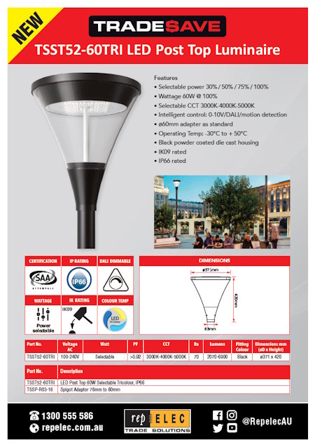Tradesave's post-top luminaire is designed to meet the evolving demands of urban lighting. Its clear, fully rounded polycarbonate housing paired with a curved reflector effectively minimises blind spots typically caused by mounting poles. The smooth exterior surfaces promote self-cleaning during rainfall, enhancing long-term performance and reducing maintenance.