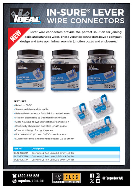 Designed to provide a versatile and cost-effective solution for faster, easier wire terminations, the IDEAL Industries IN-SURE range is re-useable and allows the use of multiple wires of different sizes and types within the same lever connector.